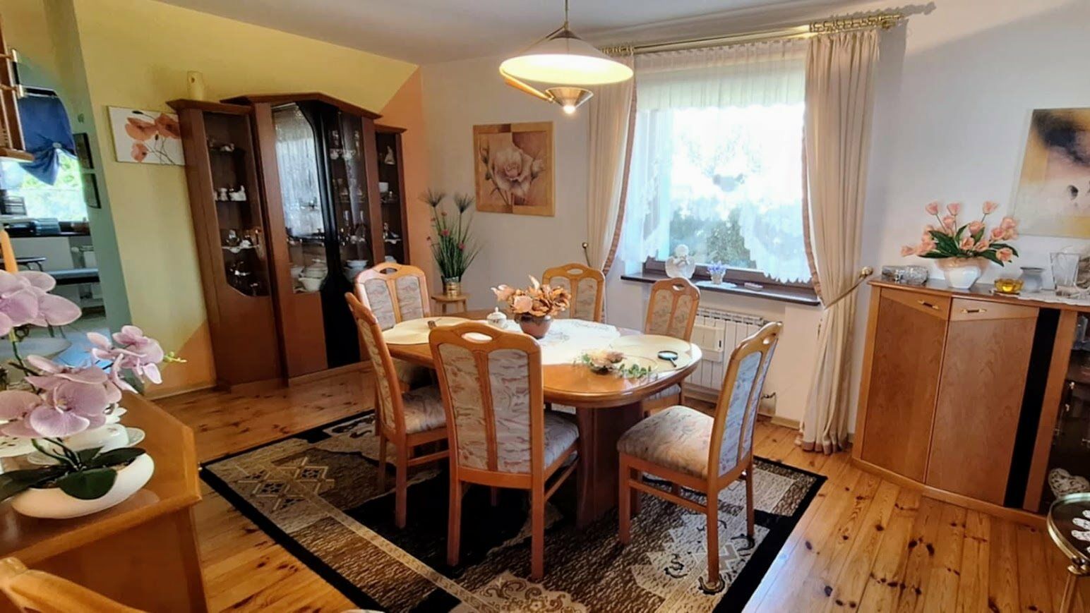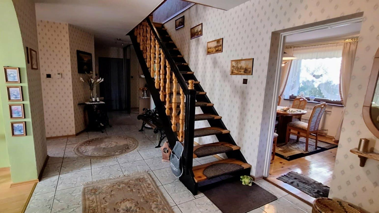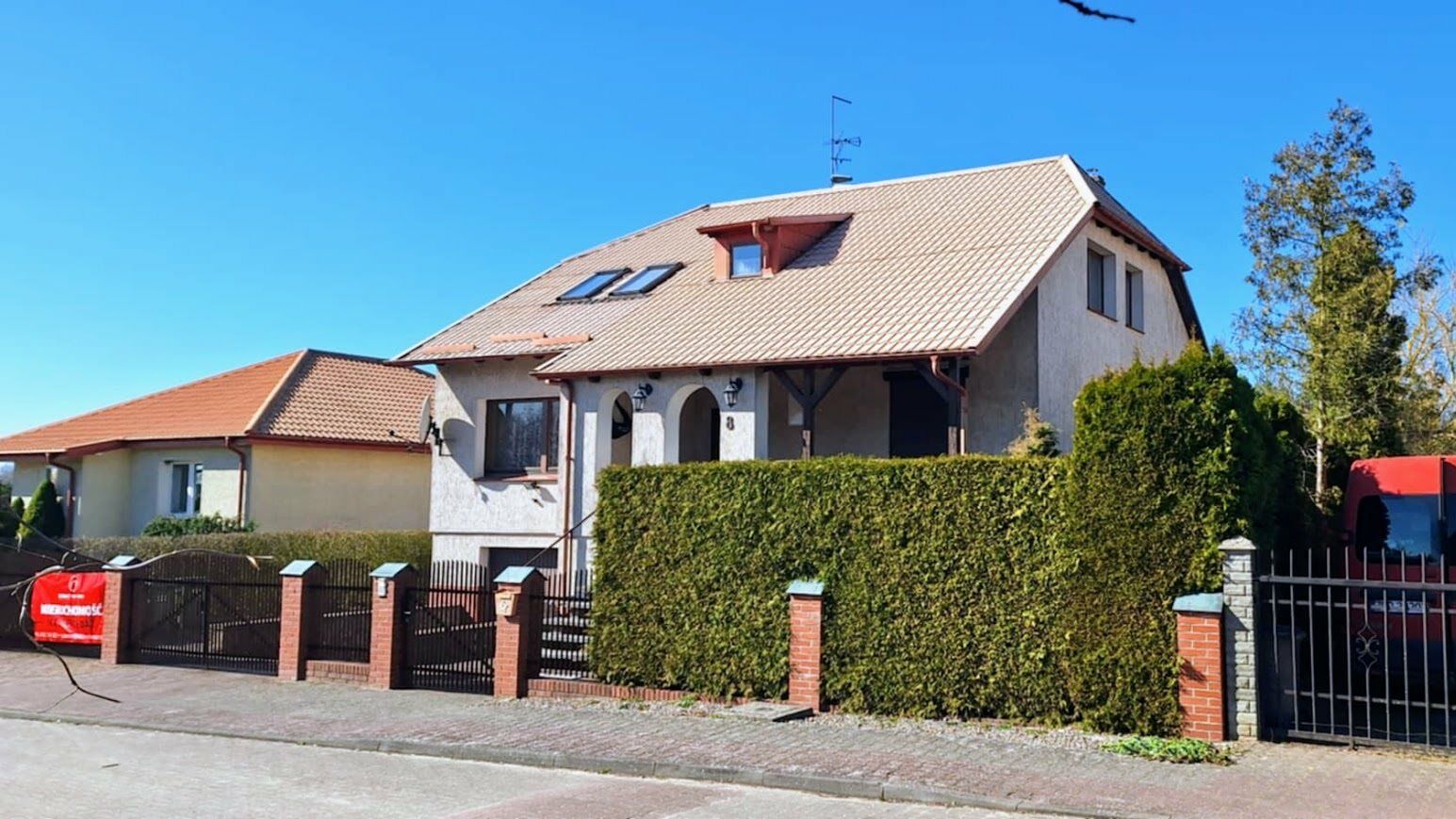 Dom wolnostojący o powierzchni 270m2. Przyziemie - 2 oddzielne mieszkania z kuchniami, łazienkami oraz niezależnym ogrzewaniem. Pralnia, kotłownia, garaż. Parter - salon, jadalnia, pokój, kuchnia, spiżarnia , łazienka. Piętro - 3 pokoje, sypialnia, łazienka, garderoba. Dwa tarasy od frontu oraz tyłu budynku. Ogrzewanie oraz ciepła woda z pieca gazowego lub na pellet i drewno. Działka 1677m2 z drzewami owocowymi , krzewami ozdobnymi , kwiatami oraz garażem blaszanym.