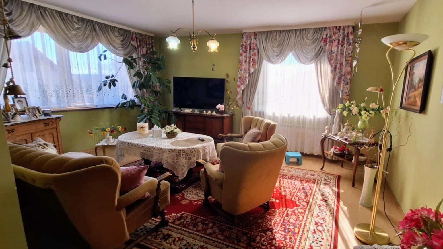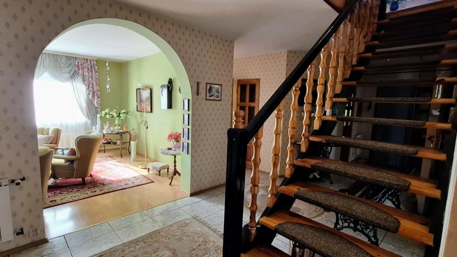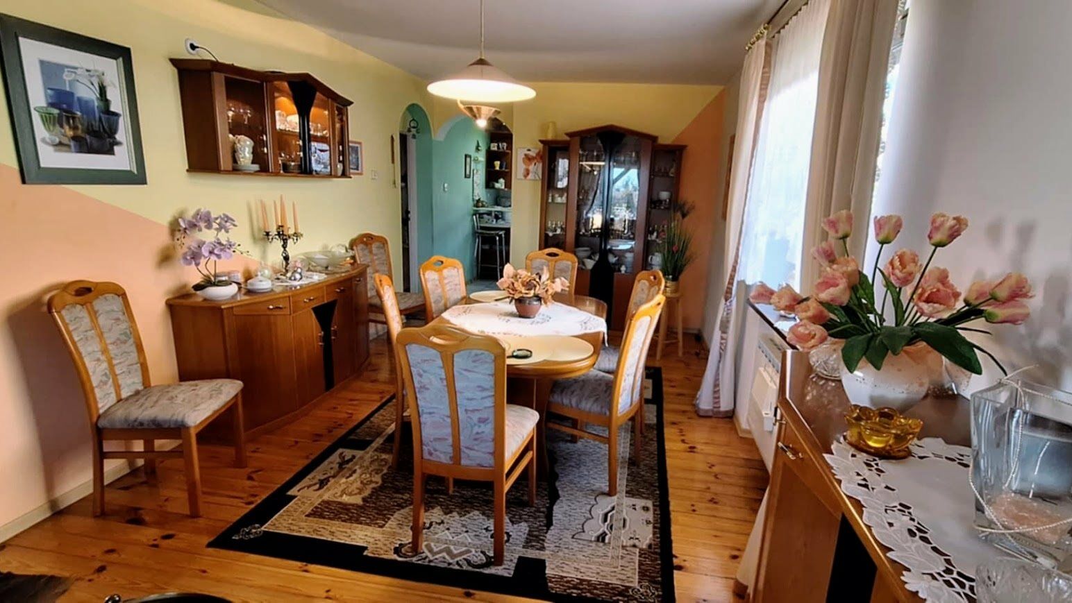 Dom wolnostojący o powierzchni 270m2. Przyziemie - 2 oddzielne mieszkania z kuchniami, łazienkami oraz niezależnym ogrzewaniem. Pralnia, kotłownia, garaż. Parter - salon, jadalnia, pokój, kuchnia, spiżarnia , łazienka. Piętro - 3 pokoje, sypialnia, łazienka, garderoba. Dwa tarasy od frontu oraz tyłu budynku. Ogrzewanie oraz ciepła woda z pieca gazowego lub na pellet i drewno. Działka 1677m2 z drzewami owocowymi , krzewami ozdobnymi , kwiatami oraz garażem blaszanym.